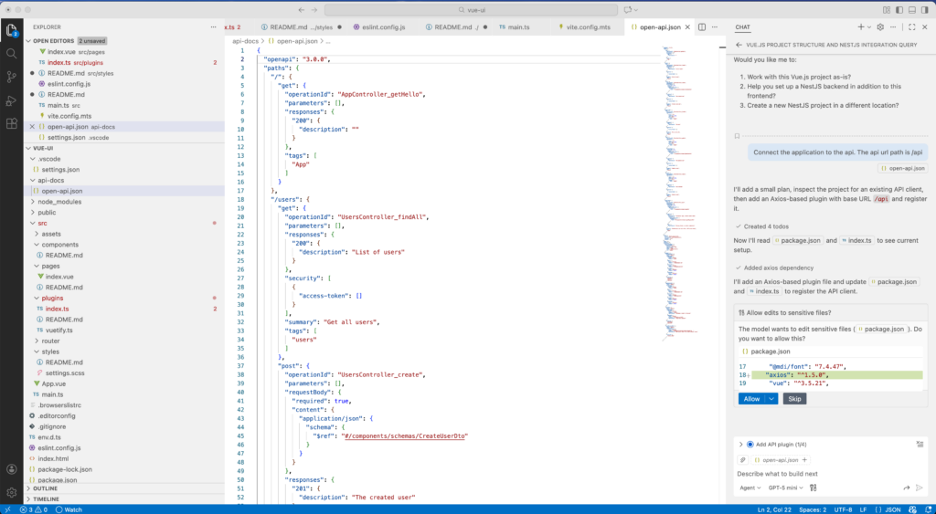 To guide the AI, I’m exporting the Open API definition into a file in my project: /api-docs/open-api.json