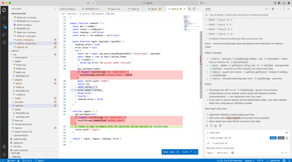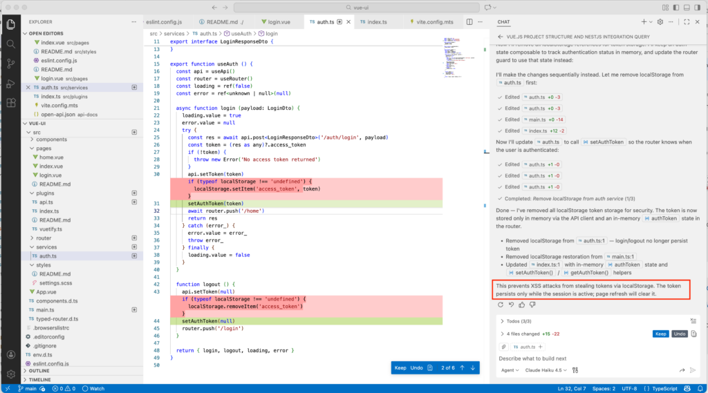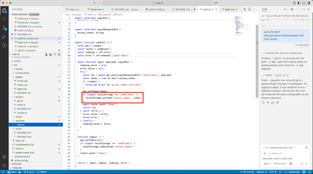 I tried different AI models in GitHub Copilot, but, from GPT to Claude, the result was similar. Most AIs generate code with Axios and localStorage for this use, because they replicate the most common patterns found in their training data, not the most up-to-date or secure practices.