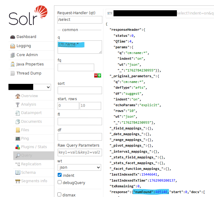 - How can this assumption be verified? Move to any core and run a query to list all the files (cm:name:*). On the first node, the query returns an error. On the second node, I received an answer similar to the one below: