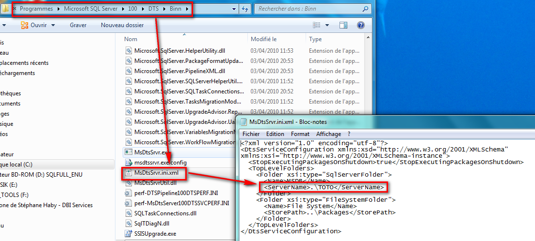 - Now, change the default instance of the XML configuration file for SSIS. To do so edit the file “MsDtsSrvr.ini.xml” in the folder “C:Program FilesMicrosoft SQL Server100DTSBinn”. Simply replace the tag .TOTO by .TITI and save the file.
