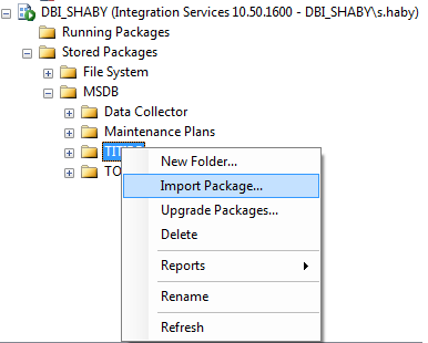 The last step is to transfer all SSIS packages, using import, to the new reference instance. Start by running the follwing SQL statement SELECT * FROM [msdb].[dbo].[sysssispackages] on the instance TOTO in order to check all SSIS Packages registered. Then import all of them one by one through each folder and sub-folder.