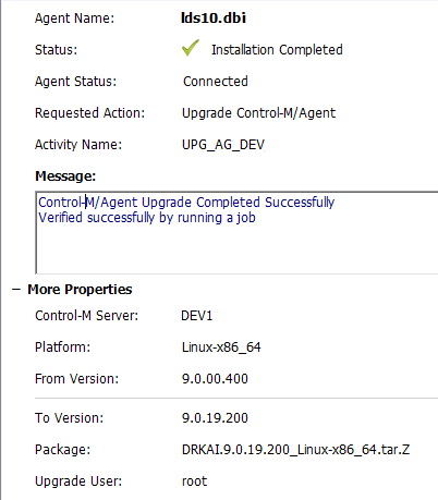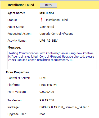 At a customer, we are upgrading Control-M Agents running on Windows/Unix from 9.0.00.400 to 9.0.19.200 using Agent Deployment, an upgrade of one agent fails with error talking about communication issue between Control-M/server and Control-M agent: