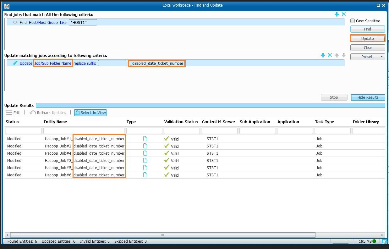 - we want to rename and disable only jobs related to hadoop and hosted by hostname HOST1 (the other jobs are hosted by HOST2)