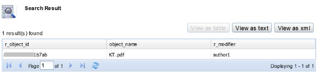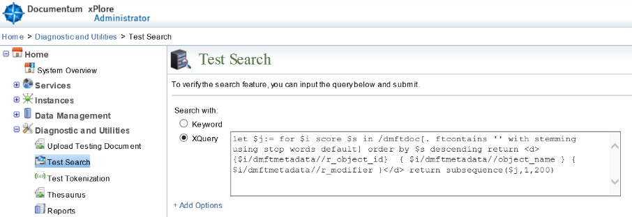 Now, let’s come back to the Documentum FullText world, in the Documentum xPlore Administrator under “Diagnostic and Utilities” -> “Test Search”, you can make search by keyword, or execute a XQuery: