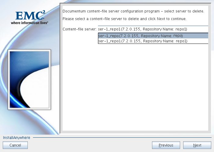 First step is to delete all remote Docbases, then delete DocBroker, and at the end uninstall the Content Server. In my case, I have 4 Content Servers (ser, ser-0, ser-01, ser-1) and I would like to decommission the ser-1.