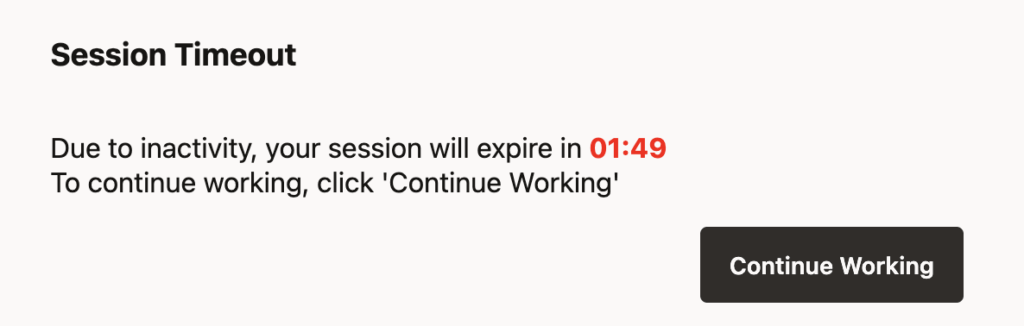 sessionDurationSecs: Duration of the authorization. Defaults to 3600 (one hour). After this delay, the session will be terminated, even if it has been active.sessionInactiveSecs: Maximum number of seconds an unexpired authorization session may be inactive before expiring. Defaults to 1800 (30 minutes). If set to 0, a session’s inactivity time will be unlimited. This parameter is the one responsible for the pop-up you see after some time in the UI (see below)