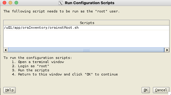 If it’s your first Oracle-related installation on this server, you might have to run the /u01/app/oraInventory/orainstRoot.sh script as root when prompted to do so.