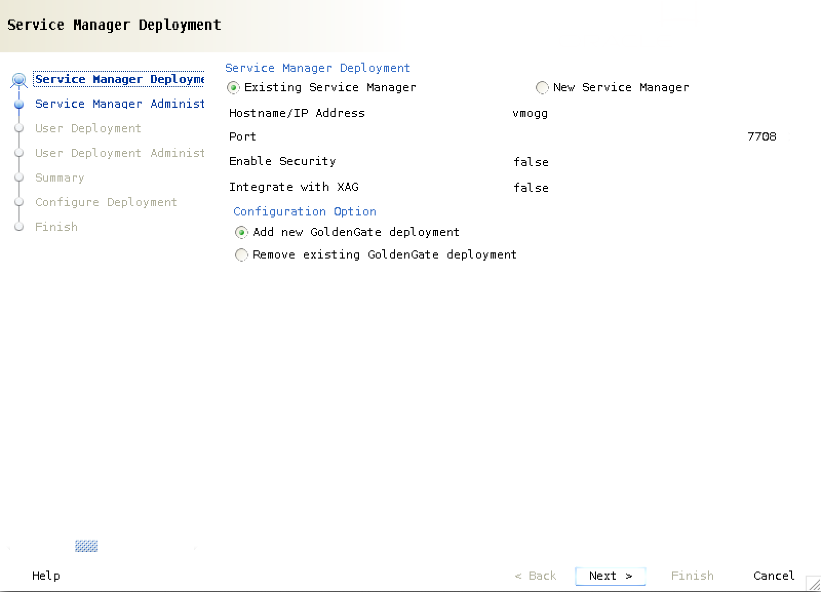 In previous versions of GoldenGate, you could first set up the service manager and wait before configuring your first deployment. It is now mandatory to set up the first deployment: