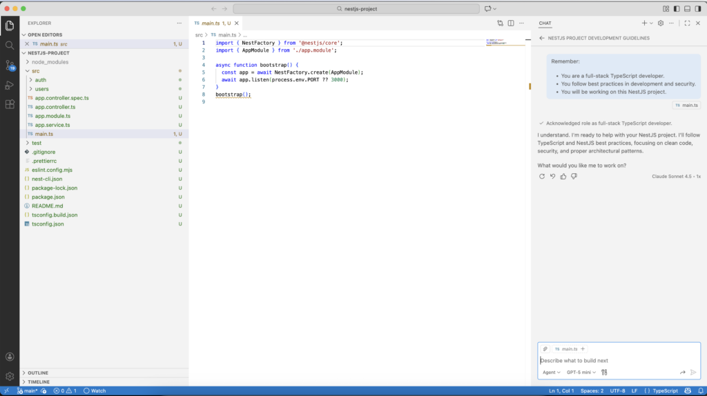 To help me, I’m going to use the GitHub Copilot agent with the GTP5-mini model. I’ll ask it to generate code on my behalf, as much as possible. However, I’ll continue to follow NestJS best practices by using the documentation recommendations and initializing the project myself. I will focus on prompting, initializing the context and reviewing the code generated by the AI.