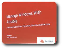 At 15:30 started the last session called “Manage Windows with Ansible”. The speaker, Götz Rieger, Senior Solution Architect showed how to manage Windows Servers – Step by Step using PowerShell scripts and Playbooks: