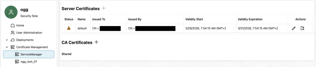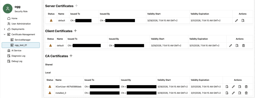 Certificate 'default' in deployment 'ogg_test_01' of type 'server' will expire in 0 days on 2026-03-31T05:54:15Z