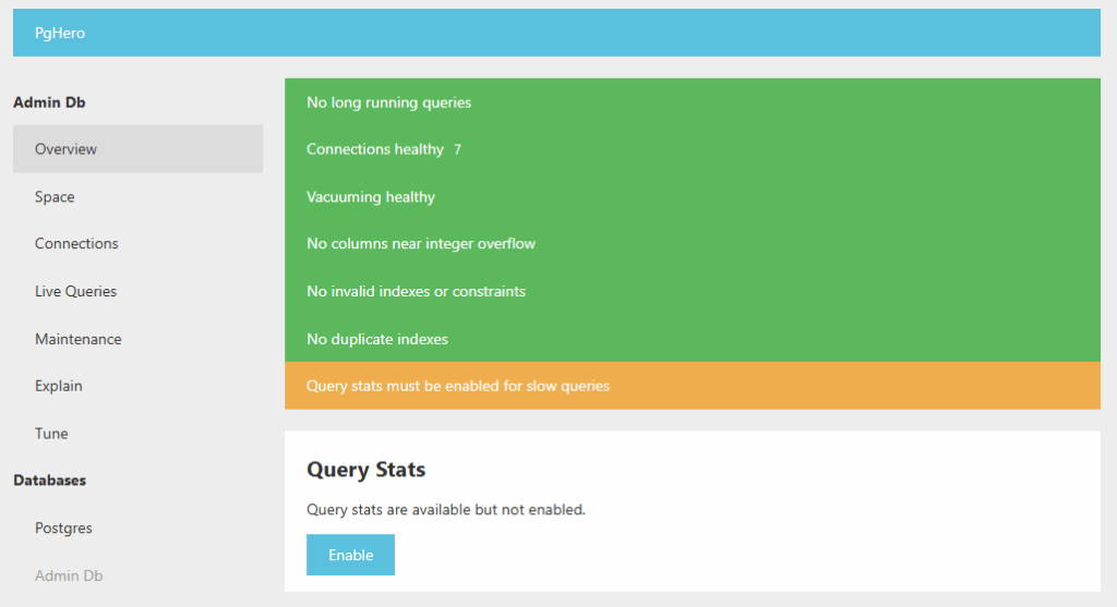 And that’s it! You now have a Windows-based Docker setup with PostgreSQL and PgHero. You can see your query stats, monitor performance, and even track multiple databases from the same dashboard.