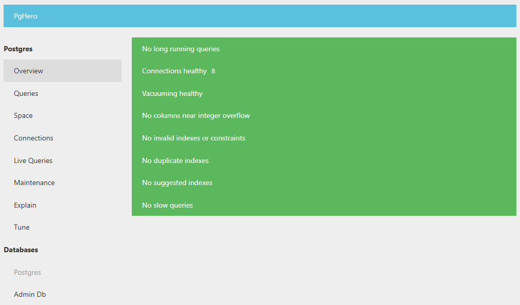 After a few seconds, open your browser at http://localhost:8080. Log in with the username and password you set (admin / secret). You should see the PgHero dashboard connected to your database.