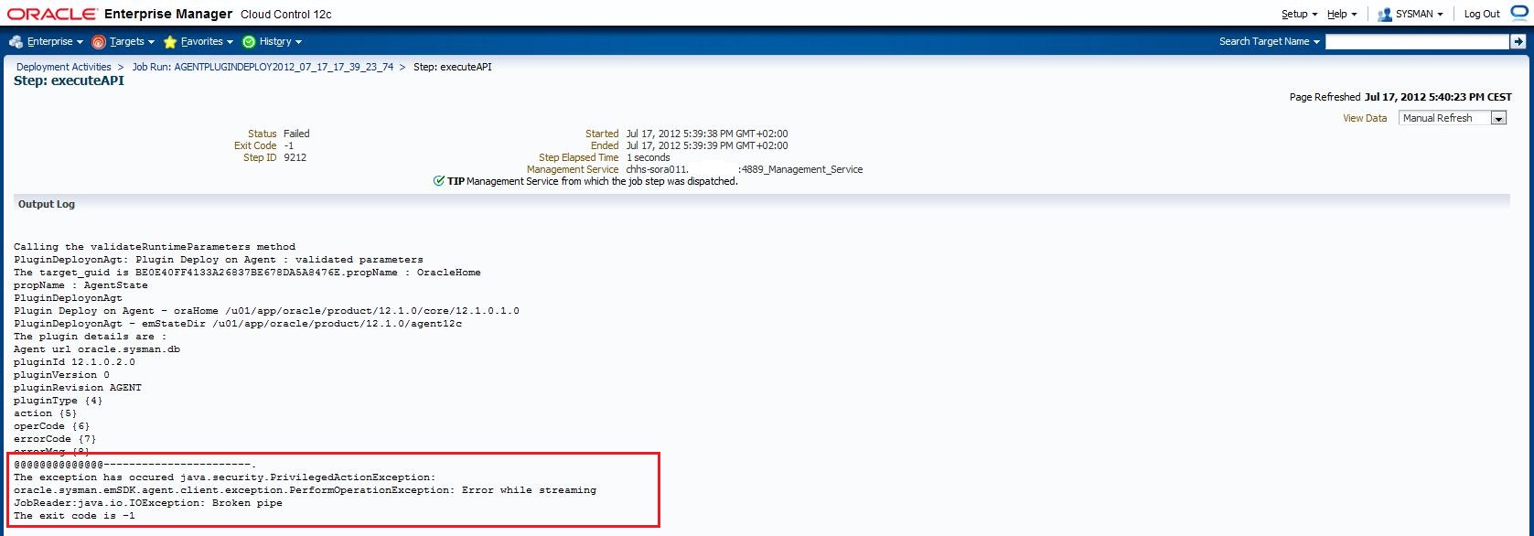 This issue is documented in the following My Oracle Support note : “EM 12c: Deploying 12.1.0.2 DB Plugin on Suse 10 64-bit server fails with “java.io.IOException: Broken pipe” [ID 1468543.1]”
