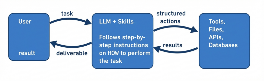 • Skills: the LLM follows procedural instructions that define not just what to answer, but how to perform tasks step by step