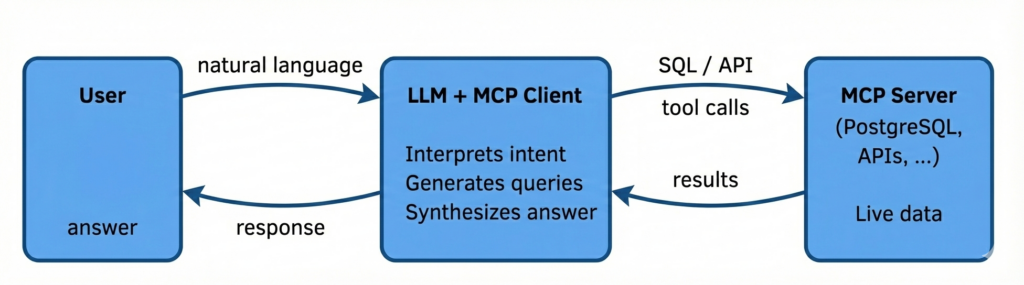 With MCP, the LLM is the intermediary. The MCP server connects to PostgreSQL, but who is the user? Is it: