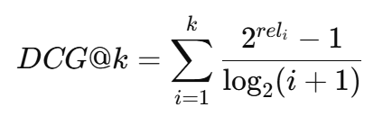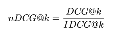 - nDCG@k normalizes this against the ideal order (IDCG):