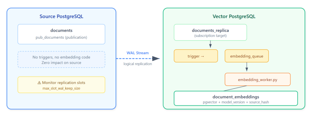 Level 2 — Logical Replication: Best when source and vector databases are separate PostgreSQL instances. The source team doesn’t need to modify anything. Built-in WAL-based CDC with automatic catch-up.