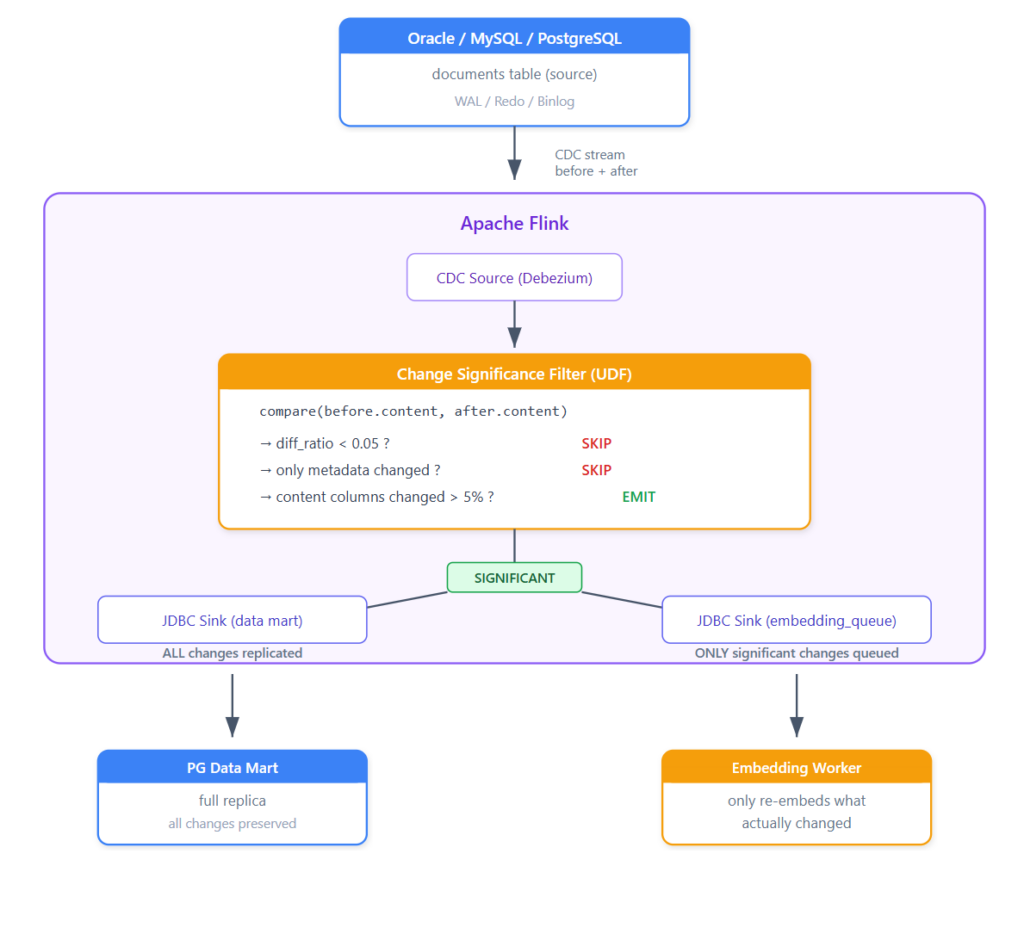 Level 3 — Flink CDC + Change Significance Filtering: Best for heterogeneous sources (Oracle, MySQL) or fan-out to multiple targets. The change significance filter is the key addition — by comparing before/after images in the pipeline, you skip re-embedding for minor changes (typo fixes, metadata-only updates, formatting), which in practice eliminates 60-80% of unnecessary embedding API calls. Start with column-aware filtering, graduate to text diff ratio with a 0.95 threshold, and tune based on your RAG quality metrics.