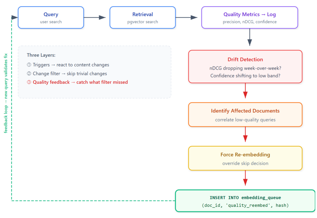 In practice, you would implement this as a periodic job (daily or weekly) that correlates low-quality retrievals with stale documents. The correlation can be as simple as ILIKE matching query terms against document titles, or as sophisticated as tracking which document IDs were returned in low-confidence results. The key is that change_type = 'quality_reembed' is a distinct signal in your queue — it tells you the re-embedding was triggered by quality degradation, not by a content change event.