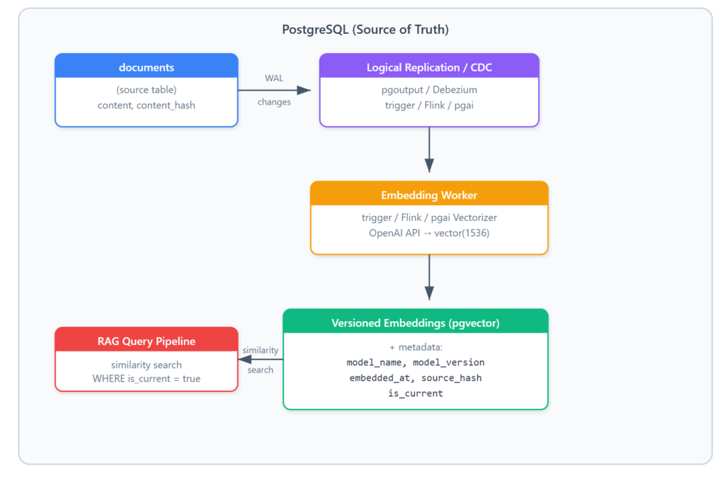 In this post, I want to bridge two worlds that I’ve been working in simultaneously: the CDC/event-driven pipelines I demonstrated in my PostgreSQL CDC to JDBC Sink and Oracle to PostgreSQL Migration with Flink CDC posts, and the RAG/pgvector world from this series.