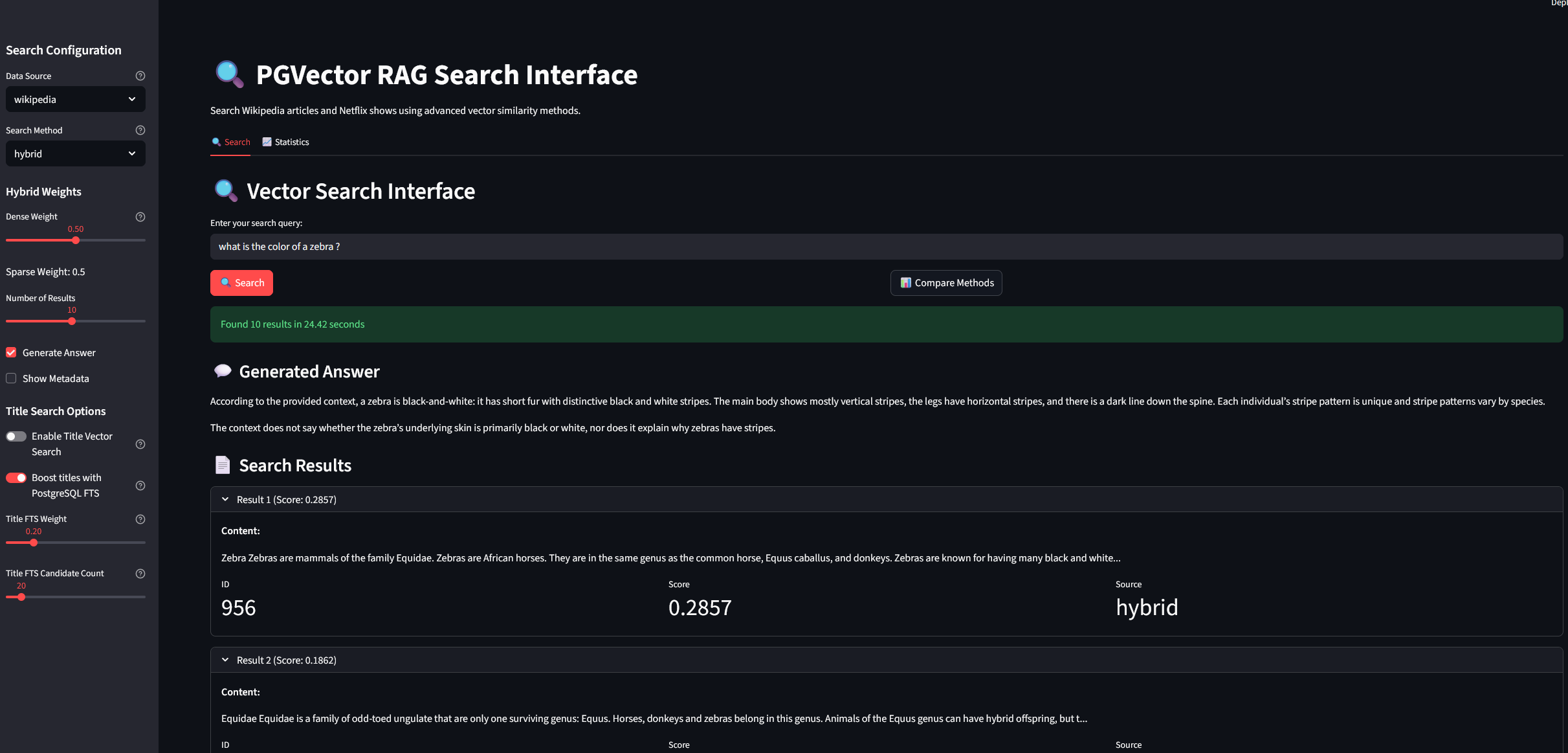 We will explore hybrid sparse-dense search implementation with PostgreSQL and pgvector, diving a bit into the mathematics behind score fusion, practical implementation patterns using the pgvector_RAG_search_lab repository, and re-ranking techniques that can boost retrieval accuracy by 15-30%. We are building on the Wikipedia dataset (25,000 articles) from the previous post, but this time we will critically examine our embedding choice and optimization strategies. The aim being for you rather to following this guide blindly, to understand it’s limitations and thus make your own choices based on experimentations.
