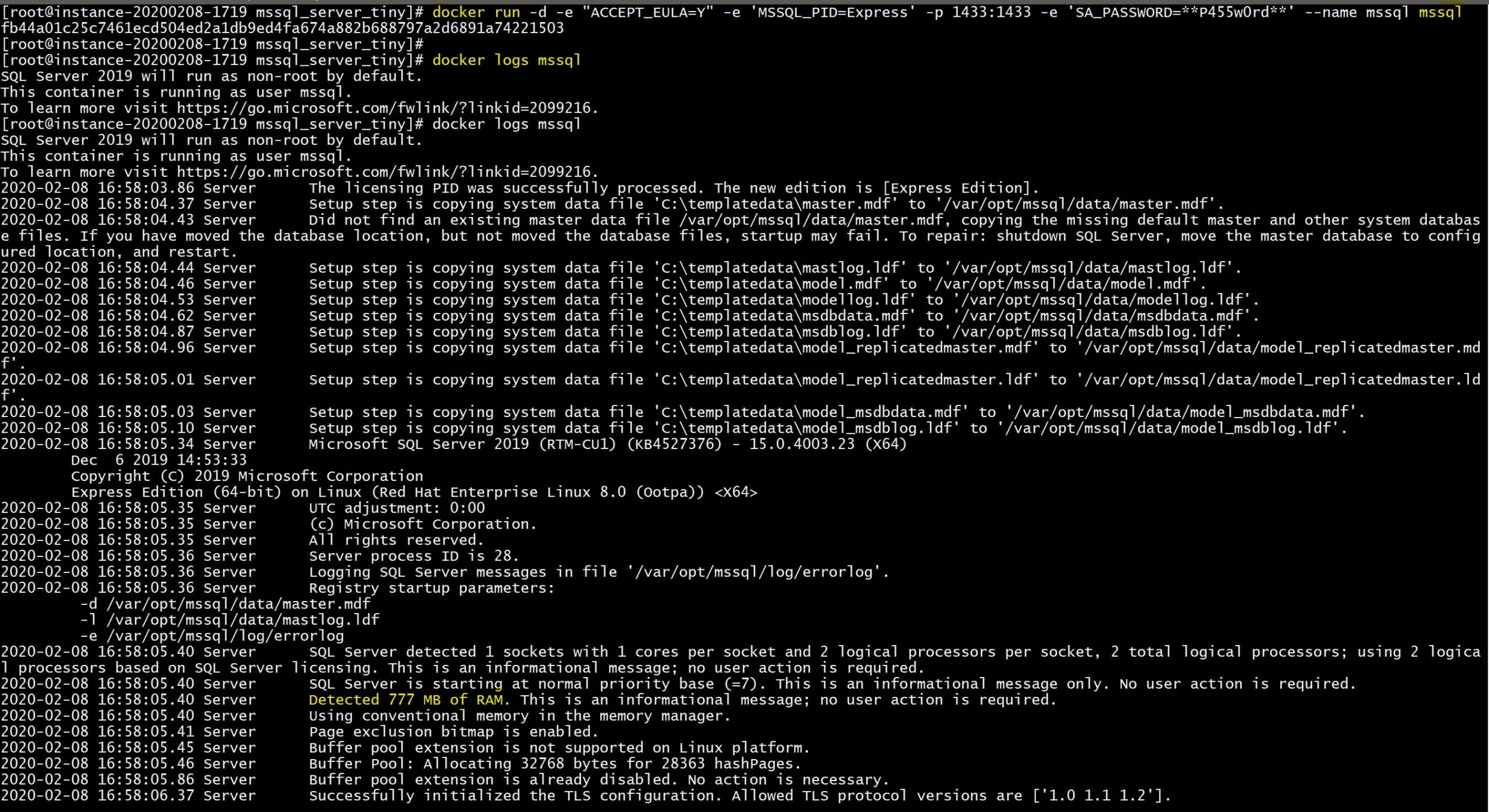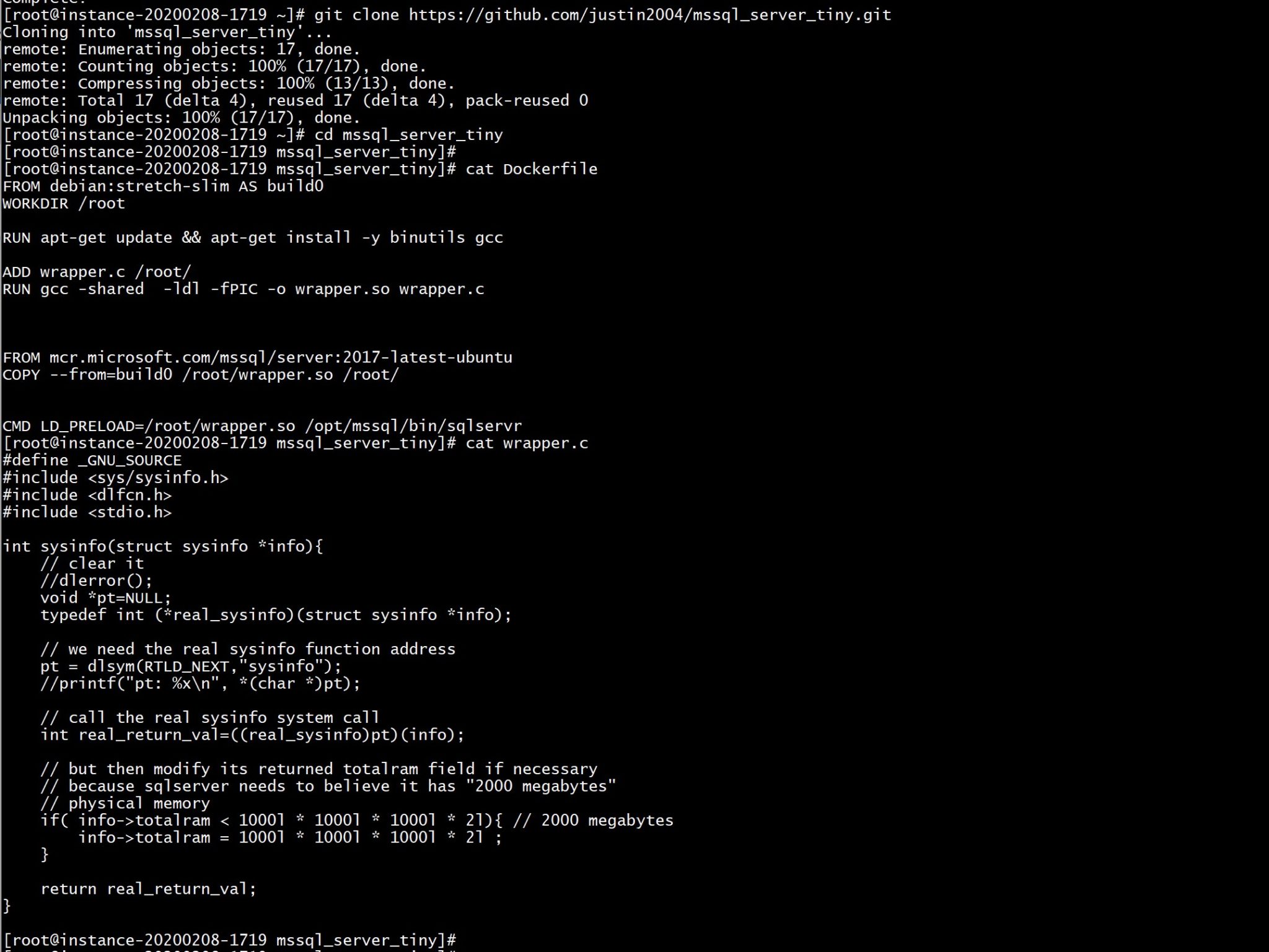 Fortunately, there’s always a nice geek on the internet with an awesome solution: hack the sysinfo() system call with a LD_PRELOAD’ed wrapper : A Slightly Liberated Microsoft SQL Server Docker image