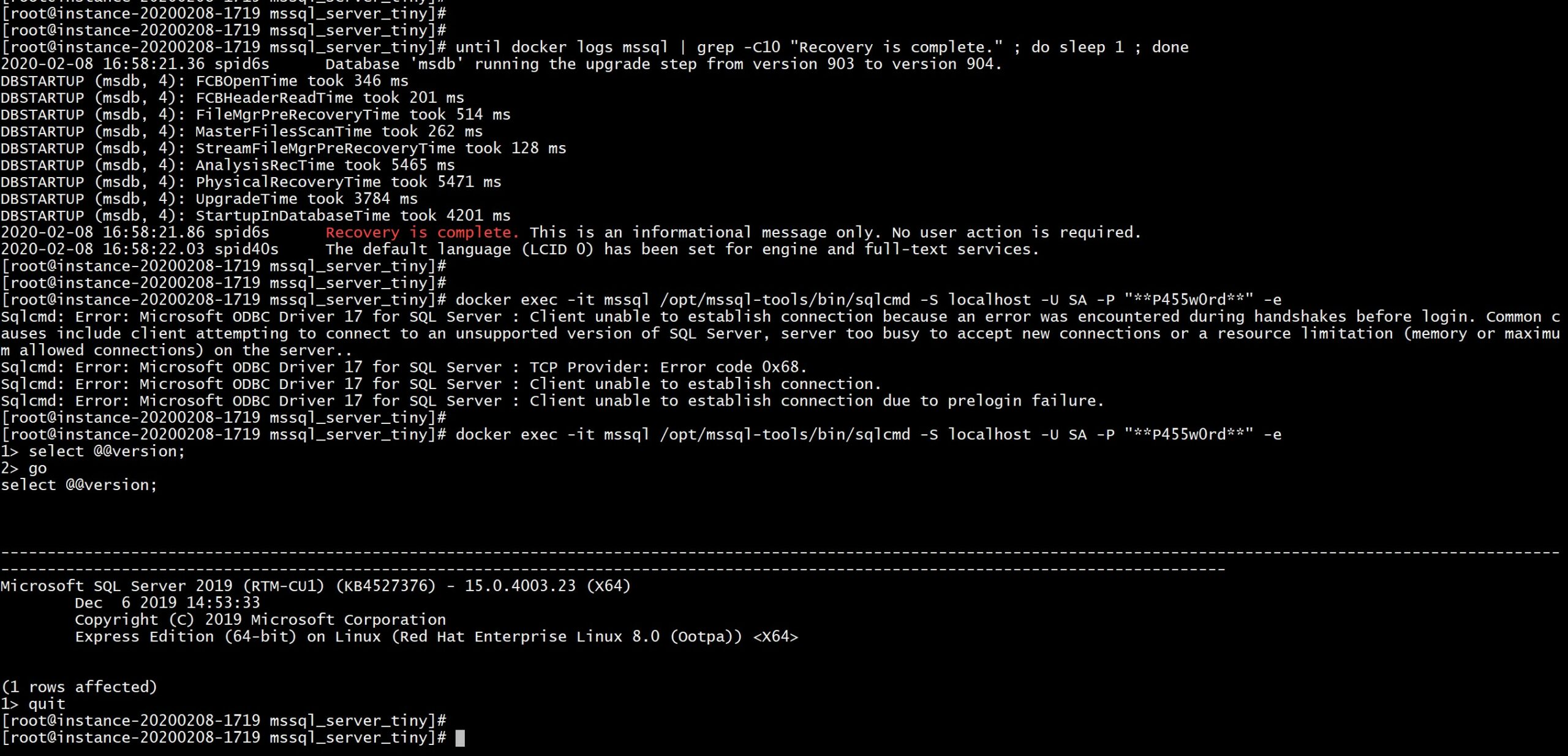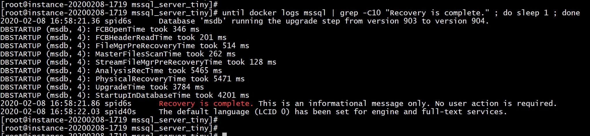 until docker logs mssql | grep -C10 "Recovery is complete." ; do sleep 1 ; done