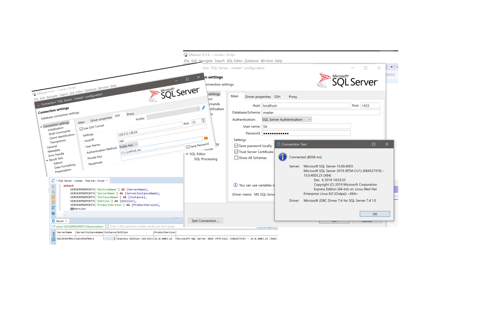 The port 1433 is exposed here locally and it can be tunneled through ssh. This is a free lab environment always accessible from everywhere to do small tests in MS SQL, running on the Oracle free tier. Here is how I connect with DBeaver from my laptop, just mentioning the public IP address, private ssh key and connection information: