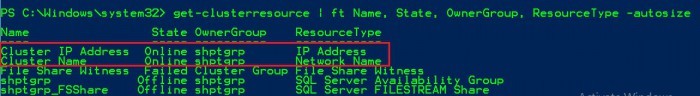 But after analysing calmly the situation (working in a maintenance windows provides some advantages. Time is not your enemy in this case), we find out how to address this issue and the solution was in fact pretty simple (I know, a solution is always simple when you get it 🙂 ) So the solution consisted in using PowerShell cmdlets. Why PowerShell? In fact, we figured out that the both cluster network name LST_SHPT and its virtual IP address resources are initially member of the cluster core group. We verified our assumption by using the Get-ClusterResource cmdlet as following: