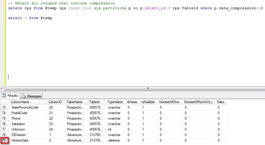 CREATE TABLE #temp ( ColumnName varchar(50), ColumnID int, TableName varchar(50), TableId int, TypeName varchar(50), IsParse bit, IsNullable bit, NumberOfRow int, NumberOfRowNULL int, Ratio int) SET NOCOUNT ON