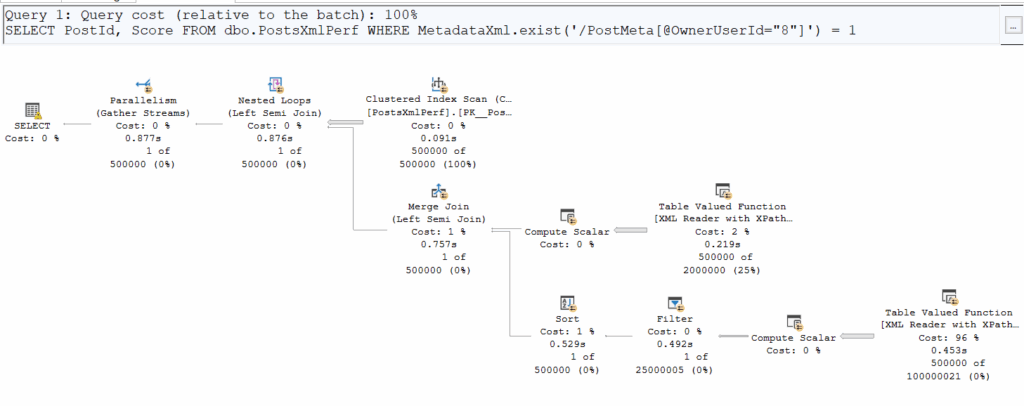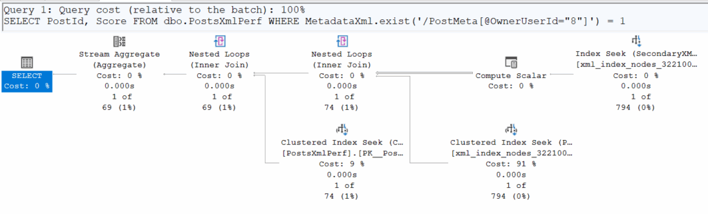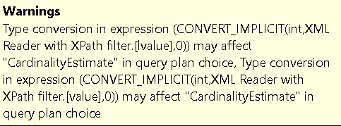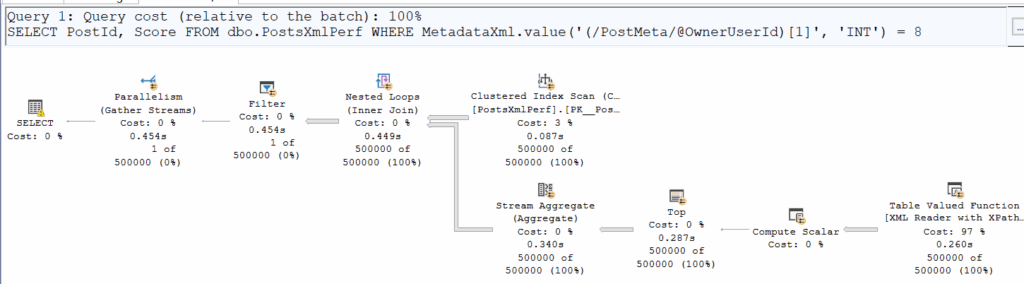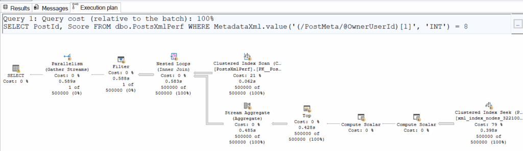 The inevitable happened: the implicit conversion makes it impossible to use the secondary XML index due to a data type mismatch, preventing an actual seek on it. We do see a seek in the second execution plan, but it occurs for every row in the table (500’000 executions) and is essentially just accessing the underlying physical structure stored in the clustered index. In reality, this ‘seek’ is SQL Server scanning the XML to retrieve the exact value of the requested field (in this case, OwnerUserId).