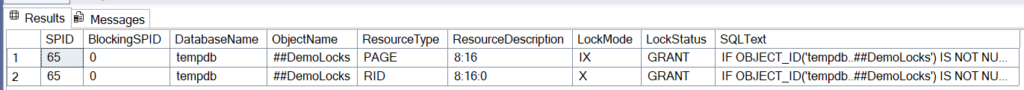 ##DemoLockstable. This indicates that a lock is active on one of its sub-elements to optimize the engine’s lock checks. - LockMode X: Exclusive lock on a