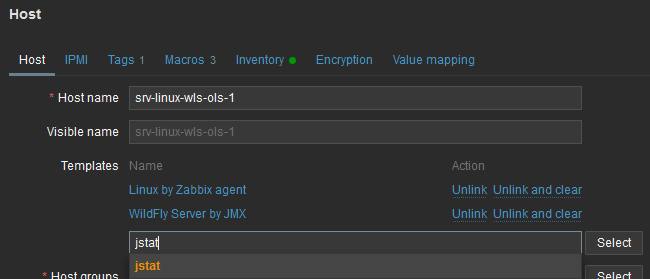 Next, we have to apply the template to the host. On the existing WildFly host, in templates field look for jstat and then Update button: